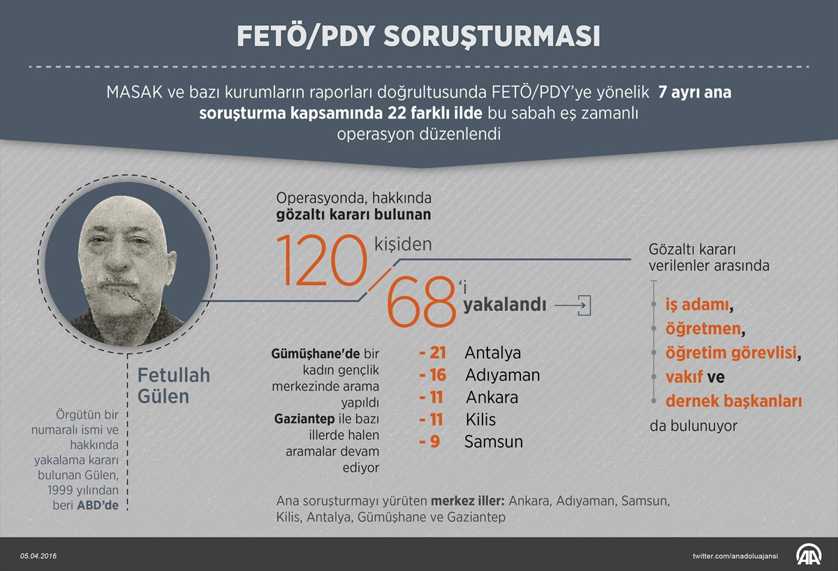 FETÖ/PDY'ye yönelik Ankara'nın da bulunduğu 7 ayrı ildeki ana soruşturma kapsamında 120 kişi hakkında gözaltı kararı verilmiş, 20'yi aşkın ildeki eş zamanlı operasyonlarda bu sabah 68 şüpheli gözaltına alınmıştı.