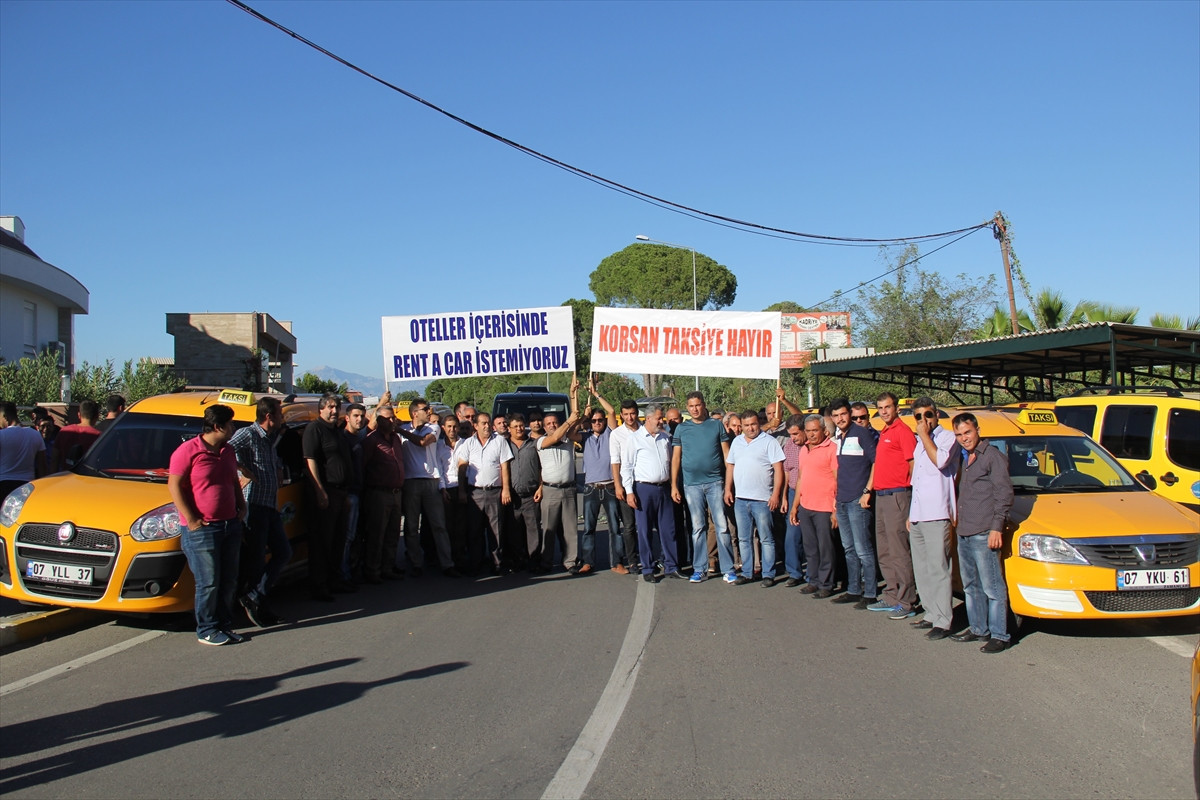 Kocabıyık, 3 yıldır otellerde faaliyet gösteren taşımacılık firmalarıyla uğraştıklarını belirterek, "Böyle bir yetkileri olmadığı halde otelden müşteri alıp transfer yapıyorlar. Bu nedenle biz taksiciler mağdur oluyoruz. Bundan önce defalarca uyarmamıza rağmen yine bildiklerini yapıyorlar. Bu sorun çözülmediği sürece burada eylemimize devam edeceğiz." dedi.