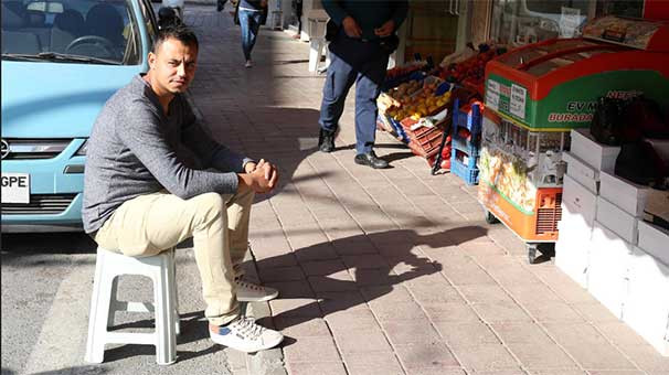 Antalya'nın Muratpaşa İlçesi İsmetpaşa Caddesi'nde market işleten Remzi Onur Alkan, işyerinin önünde caddede araçların park ettiği alana plastik taburesini koyarak oturmaya başladı.