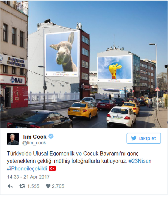 "Türkiye'de Ulusal Egemenlik ve Çocuk Bayramı’nı genç yeteneklerin çektiği müthiş fotoğraflarla kutluyoruz. #23Nisan #iPhoneileçekildi" ifadelerini kullandı ve yazının sonuna bir Türk bayrağı koydu.