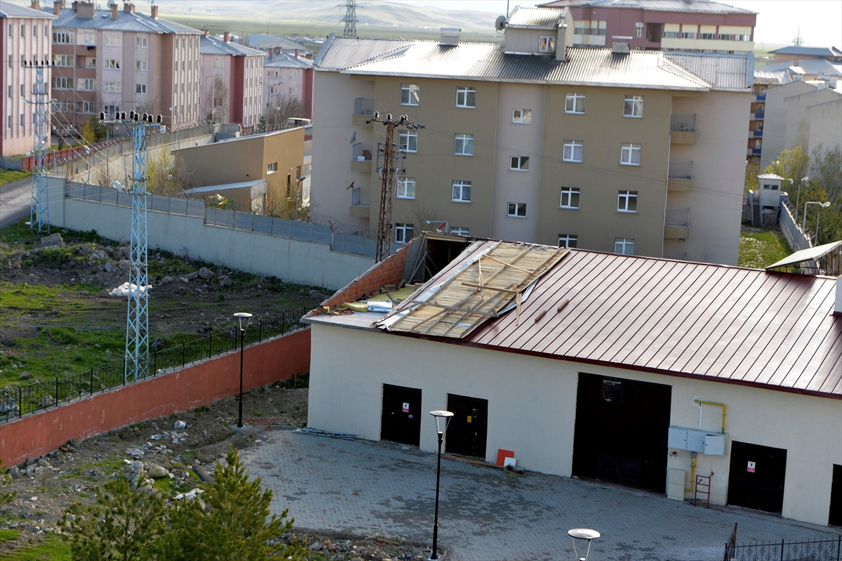 İl Sağlık Müdürlüğü binasının dış cephe kaplamasının bir kısmı sökülürken, aynı kuruma ait ısıtma sistemi binasının çatısı uçtu.