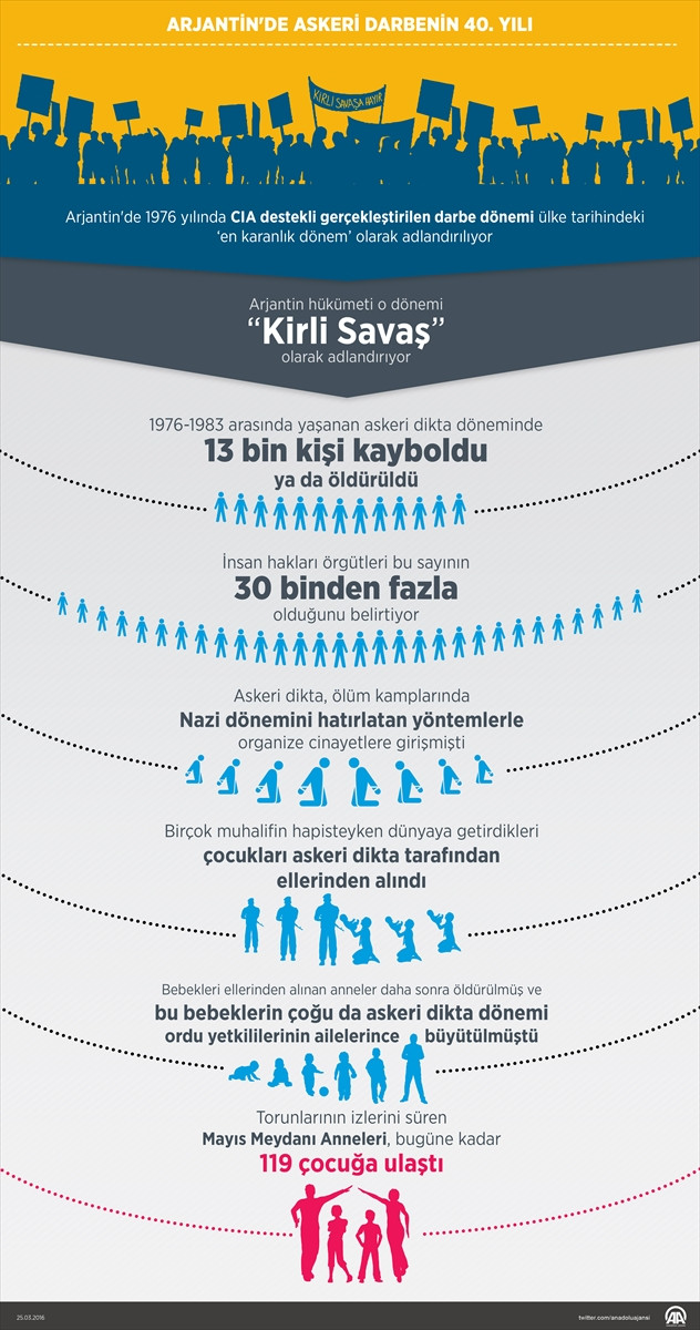 Arjantin hükümetince, “Kirli Savaş” olarak adlandırılan diktatörlük döneminde karşıt görüşlü 13 bin kişinin kaybolduğu ya da öldürüldüğü tahmin ediliyor. İnsan hakları örgütleri ise bu sayının 30 binden fazla olduğunu belirtiyor.