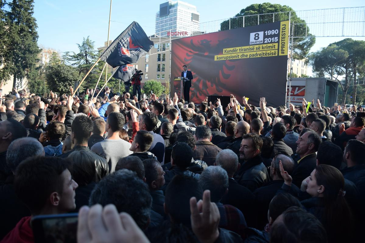 Mevcut hükümetin politikalarını eleştiren ve erken seçim talep eden muhalefet yanlıları, hükümet binası önünde toplandı. Slogan atan göstericiler, bir süre sonra binaya yumurta atıp, Başbakan Rama'nın fotoğraflarını yakmaya başladı.