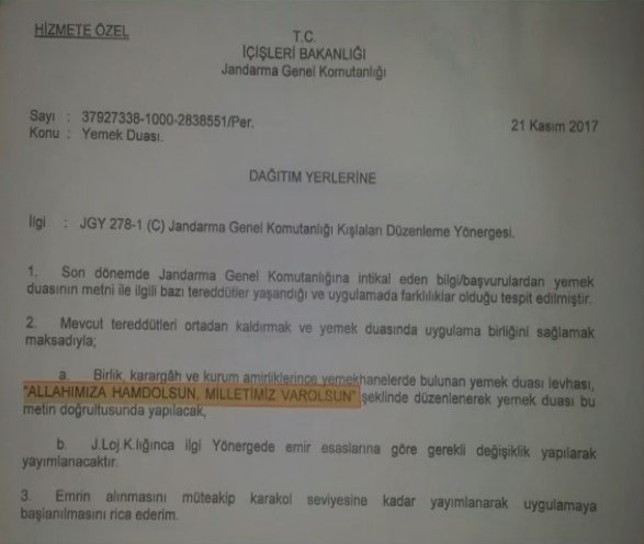 İçişleri Bakanlığı'nın yayınladığı "Yemek Duası" konulu genelgeye göre artık Jandarma da yemeklerden önce "Tanrımıza hamdolsun" yerine "Allahımıza hamdolsun" denilecek.