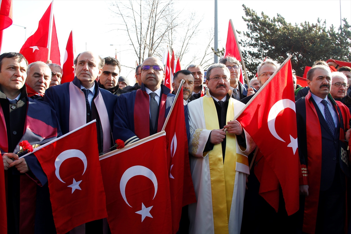 KAYSERİ (AA) - Erciyes Üniversitesi (ERÜ) Rektörü Prof. Dr. Muhammet Güven ve öğretim üyeleri, Kayseri'de çarşı iznine çıkan askerlere yönelik terör saldırısını, cübbeleriyle yürüyerek protesto etti.
