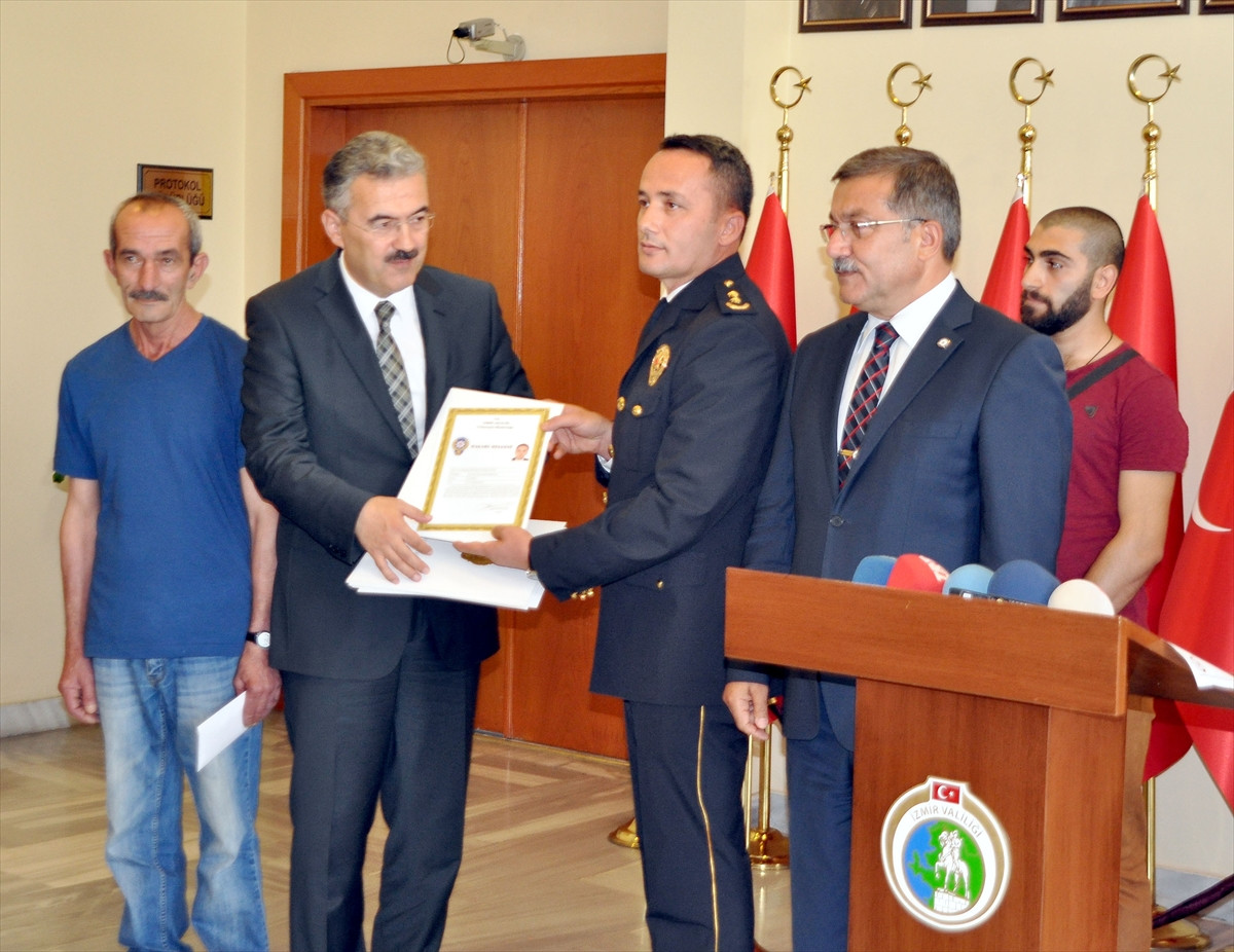 "Bu iki vatandaşımızı ve polislerimizi huzurunuzda kutluyorum. Bunun küçük bir nişanesi olarak arkadaşlarımızı ödüllendirmek istedik. Yapmış oldukları işin karşılığı olmasa bile anlamlı dursun diye bir para ödülü, başarı belgesi ve taltif olarak kardeşlerimize bir karşılık vermek istedik. Bu örnek davranış İzmir'imize ve Türkiye'mize örnek olarak duracaktır. Biz de bu güzellikleri yaşatalım, bu örnek davranış kamuoyuna mal olsun diye bu hediyeleri vermek istedik."