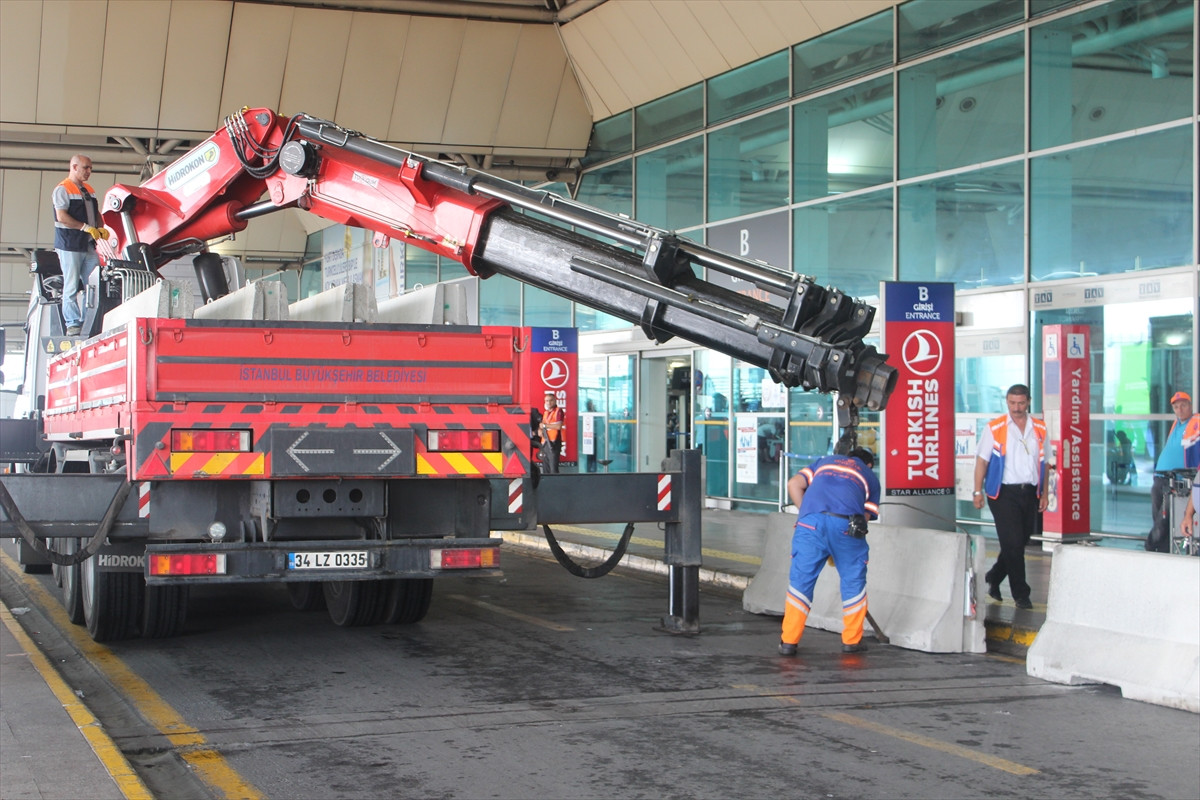 Dış hatlar terminalinin önündeki giriş-çıkış kapılarının bulunduğu alana vinç yardımıyla beton bariyerler yerleştirildi.