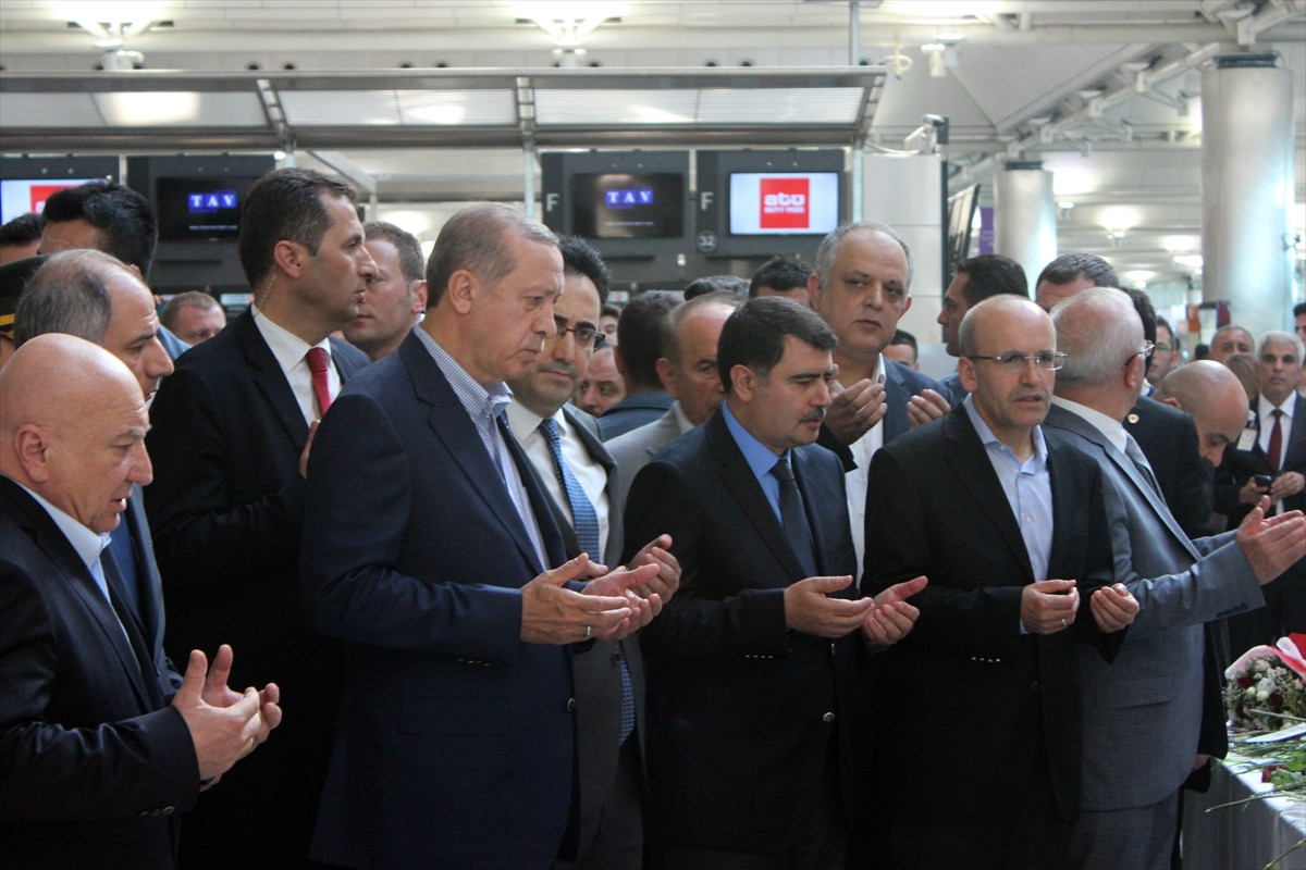 Erdoğan, İçişleri Bakanı Efkan Ala, Başbakan Yardımcısı Mehmet Şimşek, Aile ve Sosyal Politikalar Bakanı Fatma Betül Sayan Kaya, İstanbul Valisi Vasip Şahin, İstanbul Büyükşehir Belediye Başkanı Kadir Topbaş, İstanbul Emniyet Müdürü Mustafa Çalışkan ile havalimanına geldi.