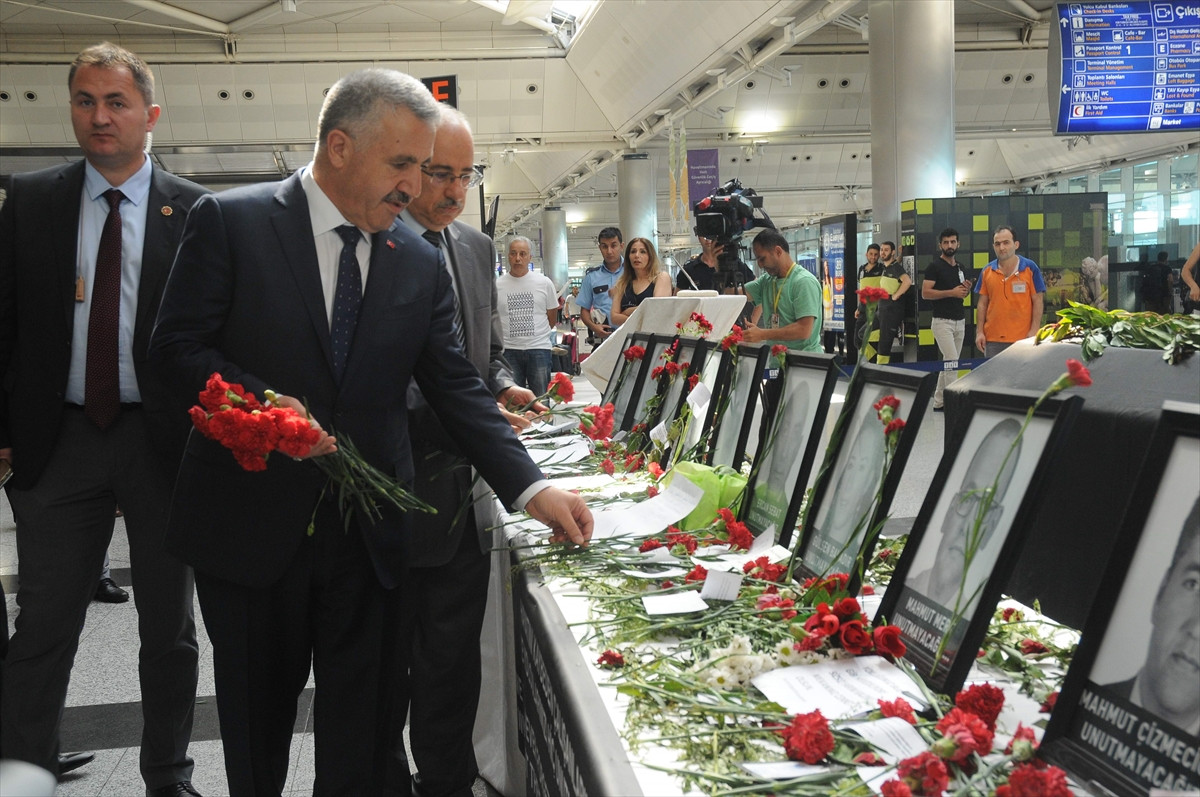 Terör saldırısında yaşamını yitiren havalimanı çalışanlarının fotoğraflarının bulunduğu dış hatlar gidiş terminalindeki anma alanına ziyarette bulunan Arslan, burada dua etti.