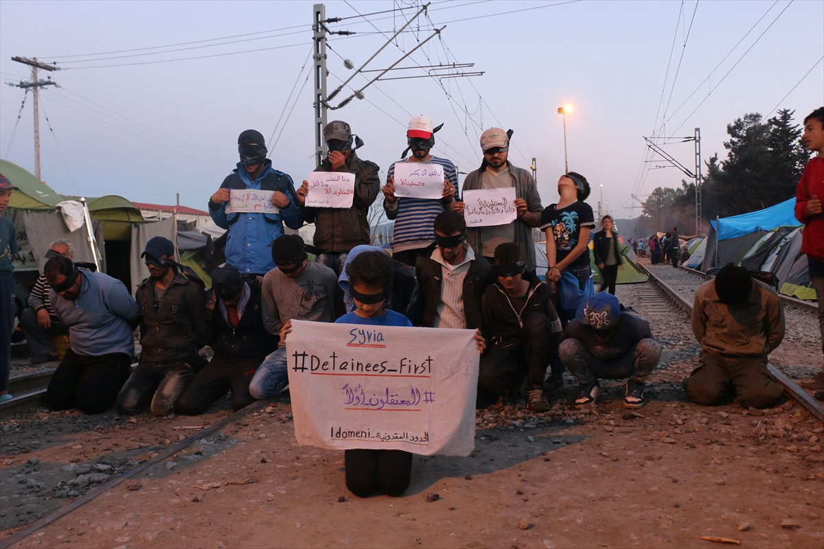 İDOMENİ (AA) - Yunanistan'ın Makedonya sınırındaki İdomeni kasabasındaki kampta barınan Suriyeli sığınmacılar, Suriye'de 2 bin kişinin Esed rejimince hapsedildiği iddiasına tepki olarak eylem gerçekleştirdi.