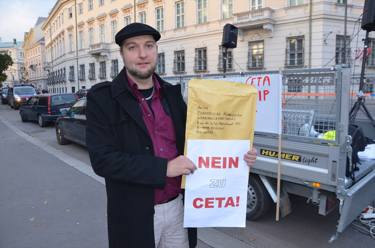Eyleme katılan aktivist Werner Haider ise CETA ve TTIP için referanduma gidilmesi gerektiğini dile getirerek, “Bizler, Avusturya insanları olarak anlaşmaların yapılış prosedürüne karşıyız. Bu konu doğrudan demokrasi konusudur. Halkın yüzde 71’i anlaşmaları onaylamıyor.” diye konuştu.