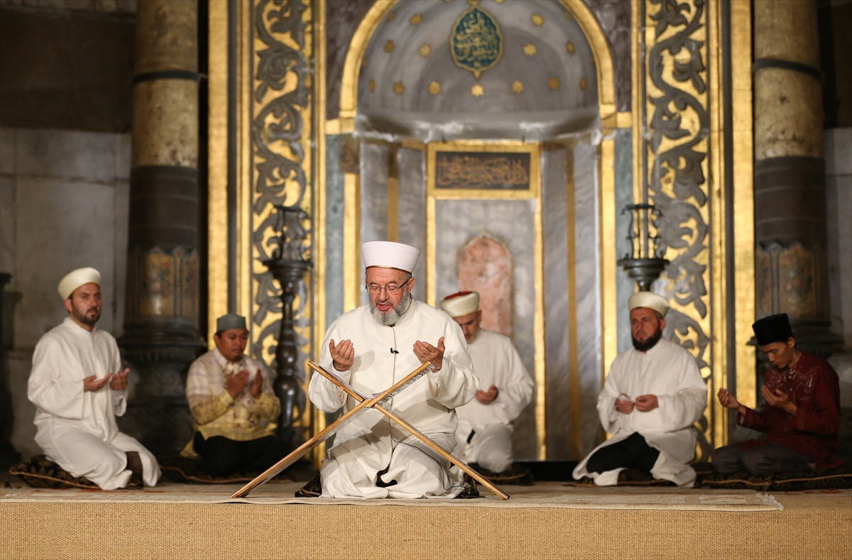 Ayasofya Müzesi'nde düzenlenen programa, Diyanet İşleri Başkanı Görmez, Ankara Üniversitesi İlahiyat Fakültesi Öğretim Görevlisi ve Müezzin Fatih Koca’nın yanı sıra Uluslararası Kur’an-ı Kerim okuma yarışmasında derece alan hafızlar da katıldı. Program öncesinde dereceye giren hafızlar Kur’an-ı Kerim ve ilahiler okudu. İstanbul Müftüsü Rahmi Yaran tarafından dua edildi. Görmez, konuşmasına İslam aleminin mübarek Kadir Gecesi'ni tebrik ederek başladı. Bin aydan daha hayırlı olan Kadir Gecesi'ni idrak etmenin onurunu yaşadığını belirten Görmez, şunları kaydetti: "Yüce Rabbimiz milletçe kadrimizi yüceltsin. Alem-i İslam'ı en kısa zaman kadri yüce bir ümmet olmayı nasip etsin. Rabbimiz bizlere Kadir Gecesi'ne Kur'an'da müstakil bir sure tahsis etmiş. O geceyle ilgili söylenebilecek ilk ve son sözü mutlak sözün sahibi yüce Rabbimiz söylemiş. 'Biz o Kur'an'ı Kadir Gecesi'nde indirdik' buyuruyor. Bu ayet bize, Kadir Gecesi'nin faziletini gecenin karanlığında değil, o gecenin bize getirdiği kitapta aramamız gerektiğini ifade ediyor. Biz bazen Kur’an-ı Kerim'i ikinci planda tutarak geceyi önceleyebiliyoruz. Yahut ramazanı birinci plana alarak Kur-an’ı ikinci planda tutabiliyoruz. Ramazanı ramazan kılan nasıl ki Kur’an’dır, Kadir Gecesi'ni Kadir Gecesi yapan da Kur’an-ı Kerim’dir.’’ - "Katledilen sadece canlarımız değil, İslam’ın insanlığa getirdiği yüce değerlerdir" Atatürk Havalimanı’nda yaşanan terör saldırısını İslam dinine açılmış bir savaş olarak nitelendiren Görmez, "Son yıllarda özellikle 2 binli yıllardan itibaren İslam dini, İslam tarihi, İslam medeniyeti yepyeni bir durumla karşı karşıyadır. İlk defa İslam coğrafyasının tamamı küresel güçlerin çatışma alanına dönüştükten sonra içinden çıkan birtakım düşünceler, birtakım ideolojiler ve birtakım cinayet şebekeleri çok farklı manzaralar yaşatmaya başladılar. Onun için, katledilen sadece canlarımız değil, aynı zamanda İslam dinidir. Katledilen sadece canlarımız değil, aynı zamanda İslam’ın insanlığa getirdiği yüce değerlerdir. Üç gün önce hepimiz canevimizden vurulduk." diye konuştu. Görmez, ramazan ayı içinde, Cenab-ı Hakkın rahmet ve mağfiretini üzerimize yağdırdığı bir zaman diliminde, böyle bir olayın yaşanmasının dehşet verici olduğuna vurgu yaparak, şunları dile getirdi: "Kadir Gecesi öncesinde, bir iftar vaktinden sonra bayramın sevinci ve gölgesinin üzerimize düştüğü bir zamanda bu nasıl bir ideolojidir ki, havaalanında onlarca insanı hunharca katledebiliyor. Onları katlederken kendisini de katlediyor. Bayramın bayramlıklarını giyme müjdesi içinde olan çocuklar, o bayramlıkları giymeden beyaz kefenlere sarılarak ebediyete uğurlanıyor. Bu vahşeti yeryüzünde börtü böceğe karşı şefkatli ve merhametli olmayı emreden bir dinin mensubu nasıl dinden referans alarak, dinden referans aldığını iddia ederek böyle bir şeyi yapıyor? Elbette bunların sebeplerini dinde aramak beyhudedir. Bunu hepimiz biliyoruz. Bu olaylar, özellikle varoluşun gayesini yitirmiş, yaratılışın gayesini kaybetmiş, hiçlik düşüncesine kapılmış, hakikatsizlik ve gayesizlik girdabına girmiş birtakım nihilist ideolojilerin ortaya koyduğu cinnetlerdir. Bu cinnetlerin sebebi sadece bu coğrafyada aranmamalıdır. Dinden aldıklarını iddia eden bir saikle böyle bir cinayeti işleyebiliyorlarsa ve bu cinayetlerden dolayı Avrupa’da, Amerika’da, dünyanın her yerinde yaşayan Müslümanların varlığı bir güvenlik sorununa dönüşüyorsa, Müslüman çocuklar isimlerini telaffuz etmekte çekinir hale getiriliyorlarsa, İslam nefreti ve düşmanlığına dönüştürüyorlarsa, bunun topyekün İslam’a açılmış bir savaş olduğu ortaya çıkıyor. Bunun, sıradan bir terör hadisesi değil aynı zamanda topyekün İslam dinini bütün insanlığın gözünde itibarsızlaştırmak için ortaya çıkan bir cinayet şebekesi olduğunu görmemiz gerekiyor. Bunu görerek bütün Müslümanlar, ilmen, fikren ve ahlaken topyekün bir seferberlik başlatmalıdır." Gönülleri yapmanın canları yaşatmaktan geçtiğini aktaran Görmez, "(Gelin canlar yaşatalım) diyecekmişiz meğer. Ölüm makineleri hayata geçiyor. Hepsi gönülleri yapmaktan geçiyor.’’ diye konuştu. Ayasofya’da düzenlenen Kadir Gecesi programının ardından bir ilk yaşandı. 85 yıl aradan sonra Ayasofya Müzesi’nde Ankara Üniversitesi İlahiyat Fakültesi Öğretim Görevlisi ve Müezzin Fatih Koca tarafından sabah ezanı okundu. Program, Ezan-ı Şerif'in okunmasının ardından sona erdi.