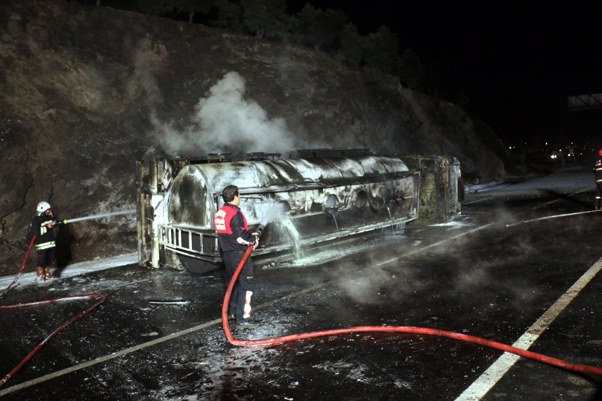 Devrildikten sonra alev alan tanker, itfaiye ekiplerinin müdahalesiyle söndürüldü.