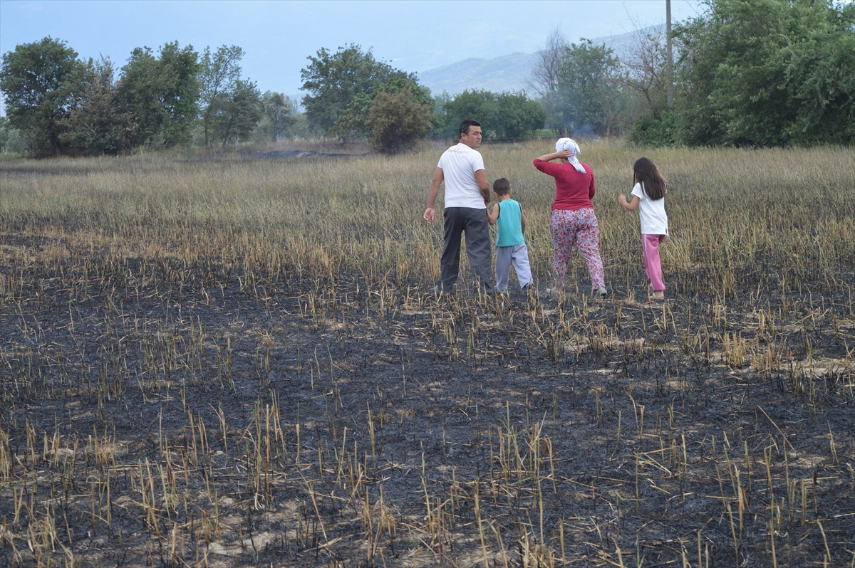 İhbar üzerine olay yerine gelen itfaiye ekiplerinin çalışması sonucu kontrol altına alınan yangında tarladaki mahsulde zarar oluştu.