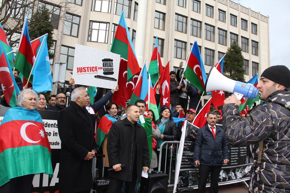 Azerbaycan ve Türk bayraklarının yanı sıra “Ermeni işgaline son” ve “Karabağ Azerbaycan’ındır” yazılı pankartlar taşıyan göstericiler sık sık “Karabağ bizimdir, bizim kalacak”, “Şehitler ölmez, vatan bölünmez” sloganları attı.