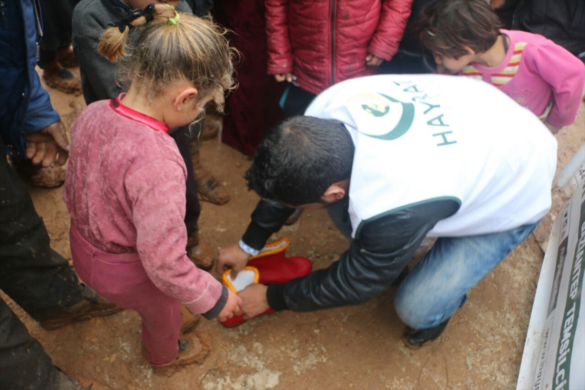 HATAY (AA) - Hayrat Yardım Derneğince, Türkiye'nin Suriye sınırının güneyinde Halep'in Azez ilçesindeki 3 bin aileye çizme, kıyafet ve battaniye dağıtıldı.