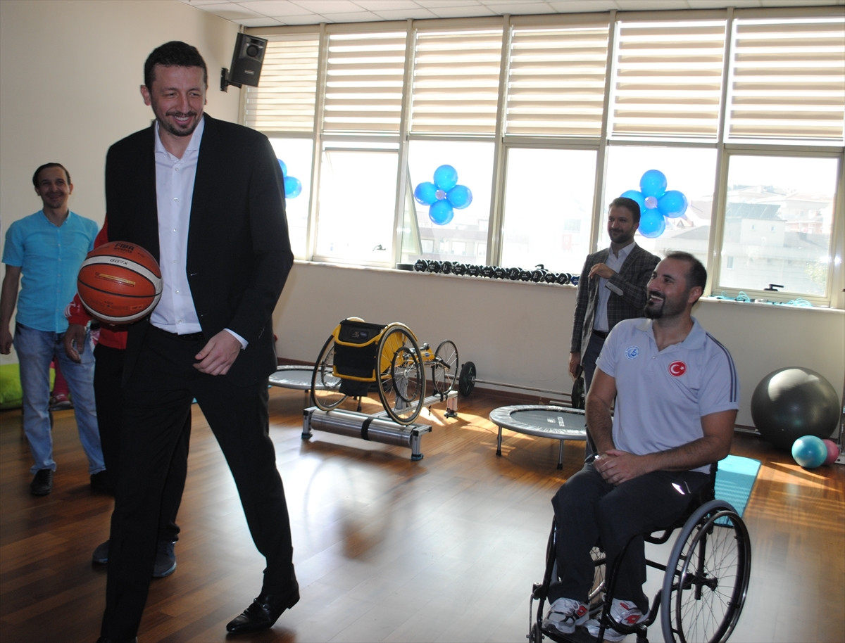 Bu arada, Türkoğlu, engelli basketbol sandalyesine oturarak, engelli basketbolcularla paslaştı.