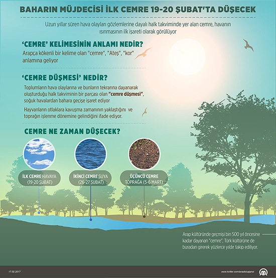 Baharın müjdecisi ilk cemre 19-20 Şubat'ta havaya, ikinci cemre 26-27 Şubat'ta suya, üçüncü cemre ise 5-6 Mart'ta toprağa düşecek.