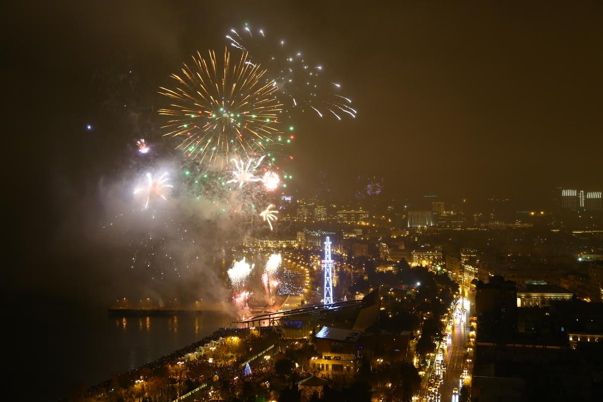 Akşam saatlerinden itibaren Hazar Denizi kıyısındaki Ulusal Park'a toplanan binlerce Bakülü, soğuk ve karlı havaya rağmen havai fişek gösterisi coşkuyla izledi.