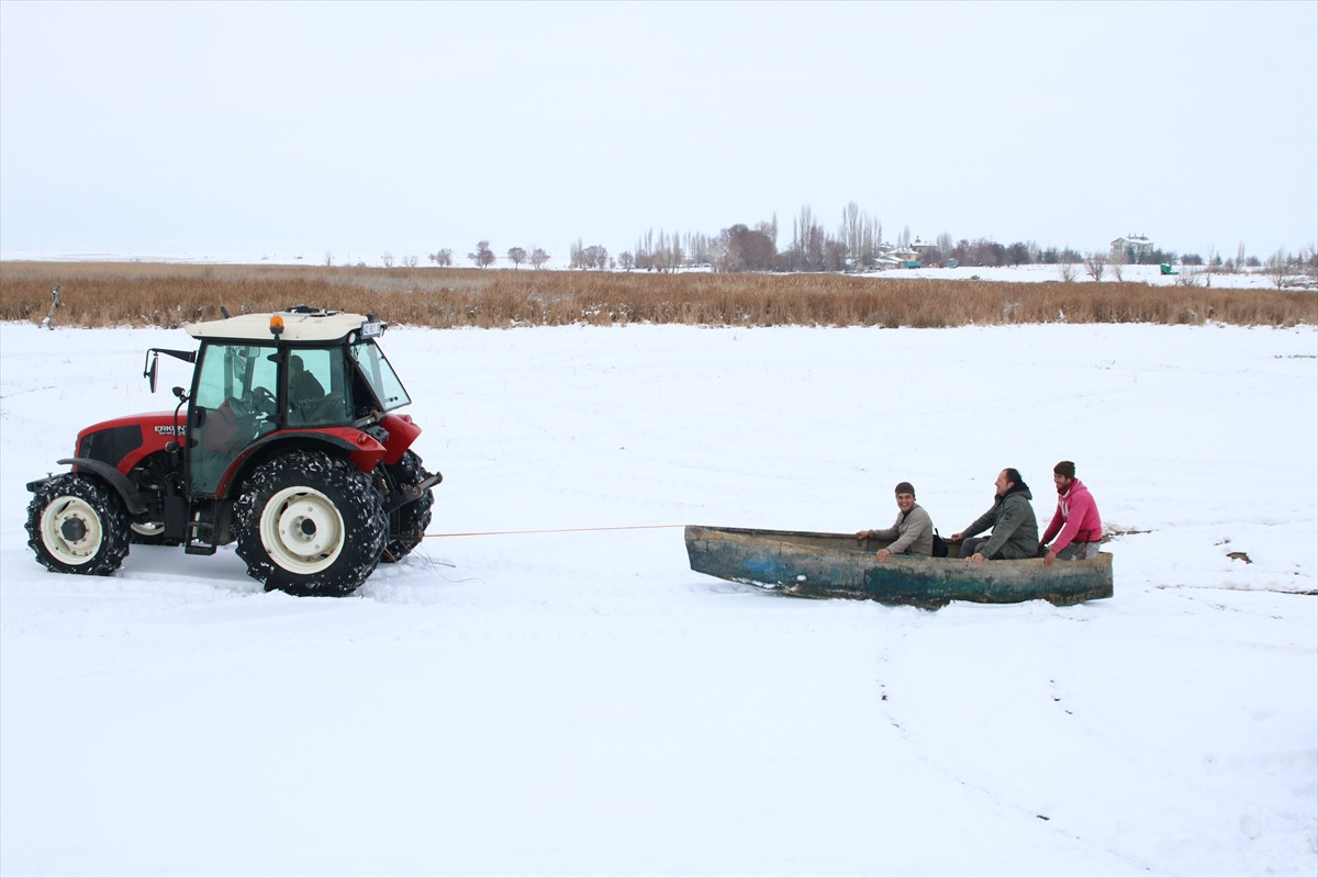 KONYA (AA) - Konya'nın Beyşehir ilçesinde balıkçılar, traktöre bağladıkları tekne ile Beyşehir Gölü'nün karla kaplanan kıyısında kayak yaptı.