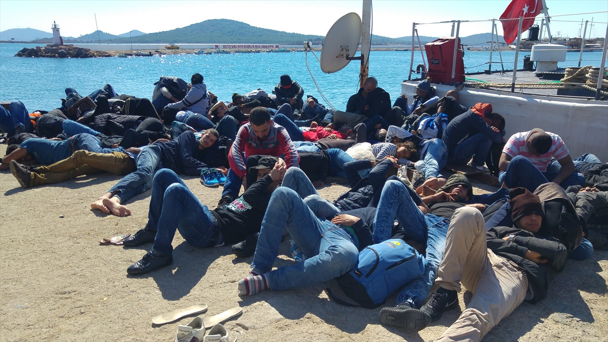 Uyarıyla durdurulan botta, Yunanistan'ın Midilli Adası'na gitmeye çalıştığı öğrenilen, Kenya, Kongo, Yeni Gine ve Suriye uyruklu, aralarında kadın ile çocukların da bulunduğu 63 yabancı uyruklu yakalandı.