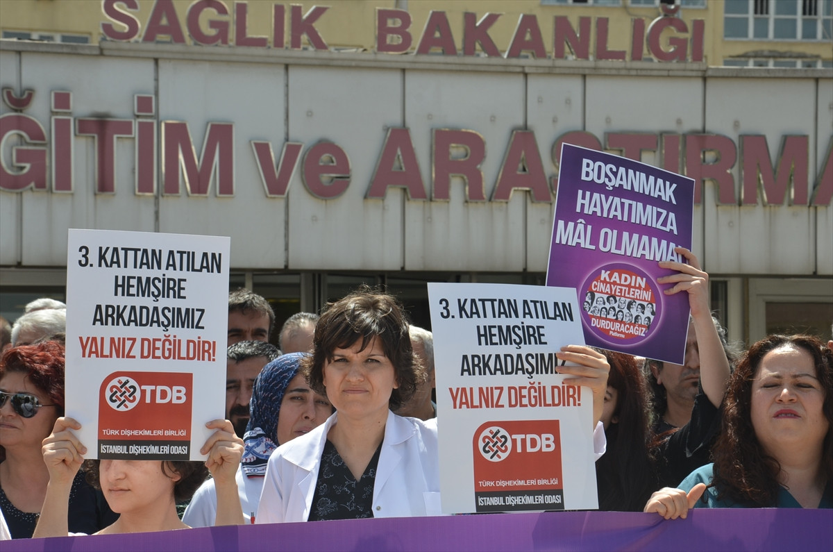 İSTANBUL (AA) - Bayrampaşa’da, tartıştığı eşinin üzerine yürümesi sonucu üçüncü kattaki evlerinin balkonundan düşerek ağır yaralanan hemşire Hatice Çelik’in uğradığı şiddet protesto edildi.