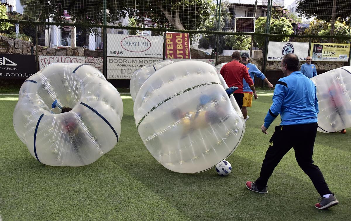 MUĞLA (AA) - Bodrum ilçesinde büyük plastik balonların içine giren çocuklar futbol oynamaya çalıştı.