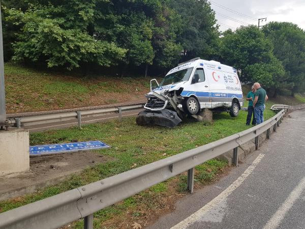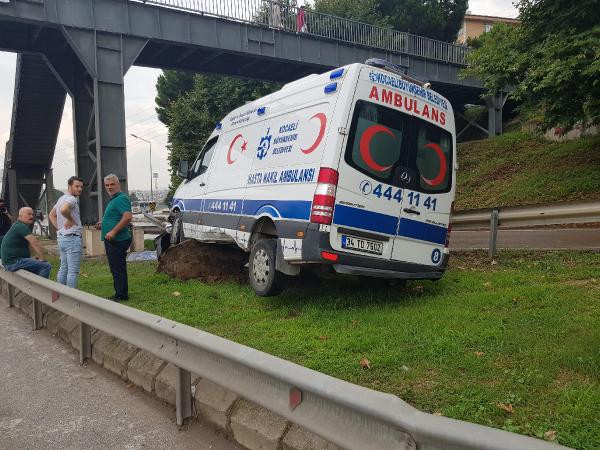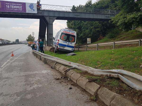 İZMİT'te, hasta almaya giden Kocaeli Büyükşehir Belediyesi'ne ait hasta nakil ambulansı, bariyerlere aşarak ilçe tabelasına çarptı. Kazada ambulansta bulunan 3 kişi hafif yaralandı.