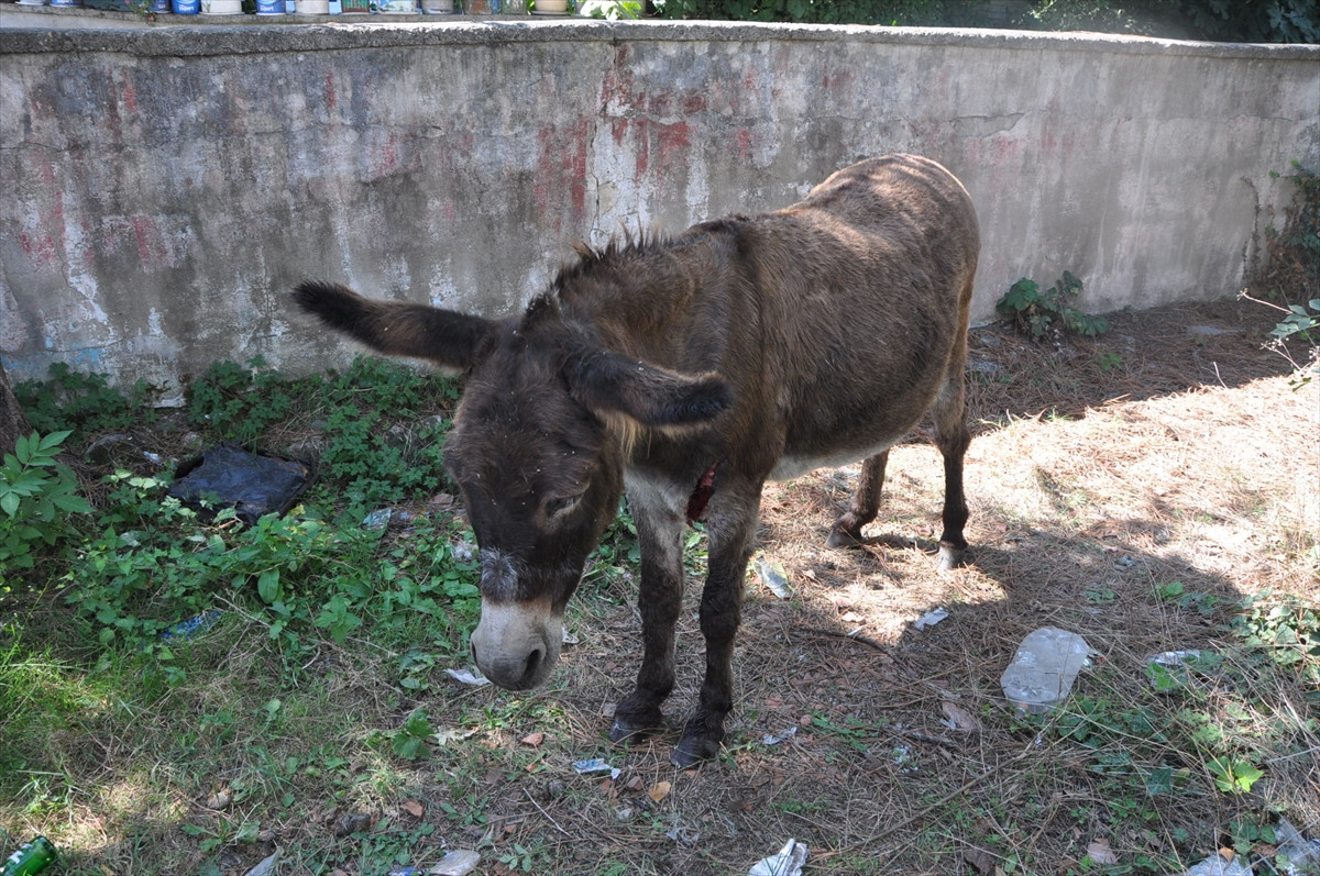 Ekipler, veteriner hekim Tolga Kandıralı ile köye geldi. Kulağında küpesi olmayan sahipsiz eşeğin yarasının 40 santim boyunda ve 7 santim derinliğinde olduğu belirlendi.