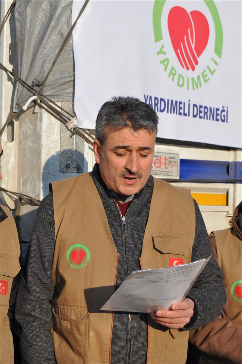 "Yardımeli derneği olarak, 'Suriye'de, Halep'te bunlar yaşanmamalıydı' dedik. Dünya insanlığının vicdanını harekete geçirmek için var gücümüzle bu feryadı duyurmaya çalıştık ve işte bugün vicdan sahibi vatandaşlarımızla, bağışçılarımızla, gönüllülerimiz ve temsilcilerimizle el el vererek büyük bir gayretle oluşturduğumuz insani yardım konvoyumuzu, Hatay Reyhanlı'ya ulaştırmak için gönüllüler olarak buradayız.”