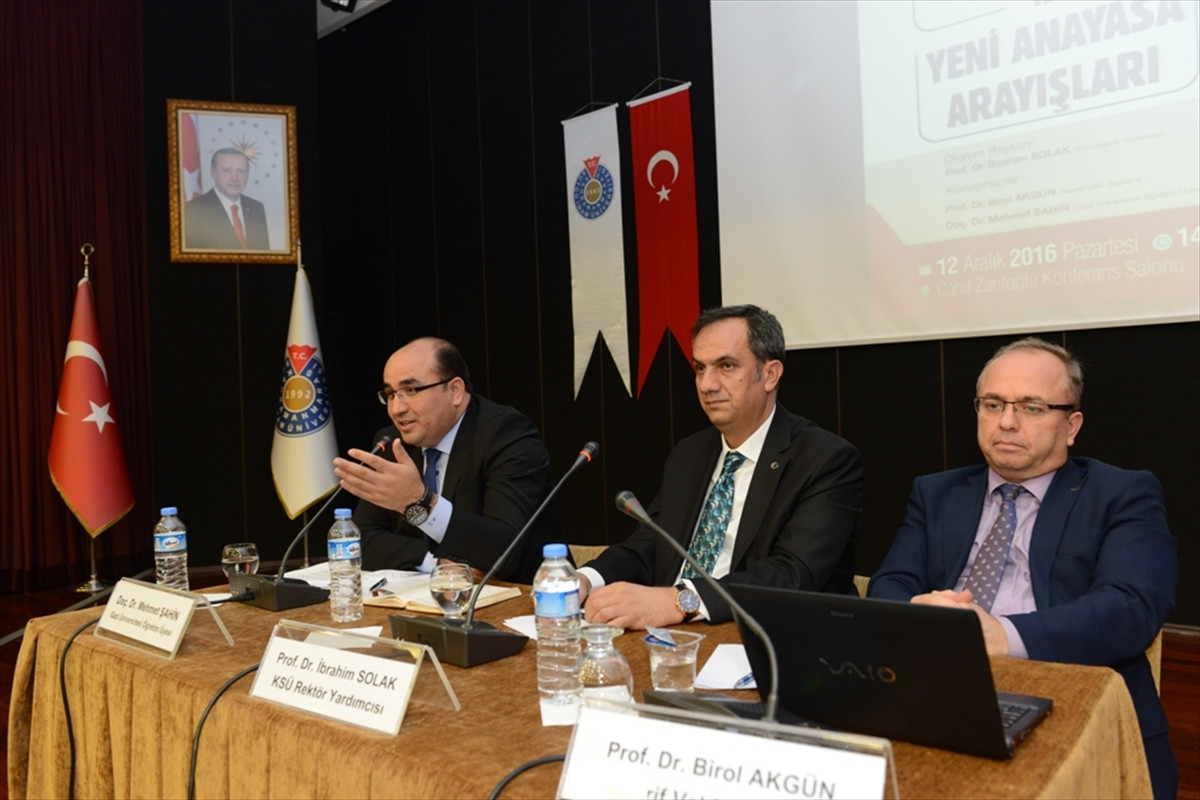 Kahramanmaraş Sütçü İmam Üniversitesi (KSÜ) Rektörlüğü tarafından Cahit Zarifoğlu Konferans Salonunda, Türkiye Maarif Vakfı Mütevelli Heyeti Başkanı Prof. Dr. Birol Akgün ile Gazi Üniversitesi Öğretim Üyesi Doç. Dr. Mehmet Şahin'in katılımıyla düzenlenen "Başkanlık Sistemi ve Yeni Anayasa Arayışları" konulu panel, İstanbul'da meydana gelen terör saldırısında şehit edilenler için okunan Kur'an-ı Kerim okunması ve dua edilmesiyle başladı.