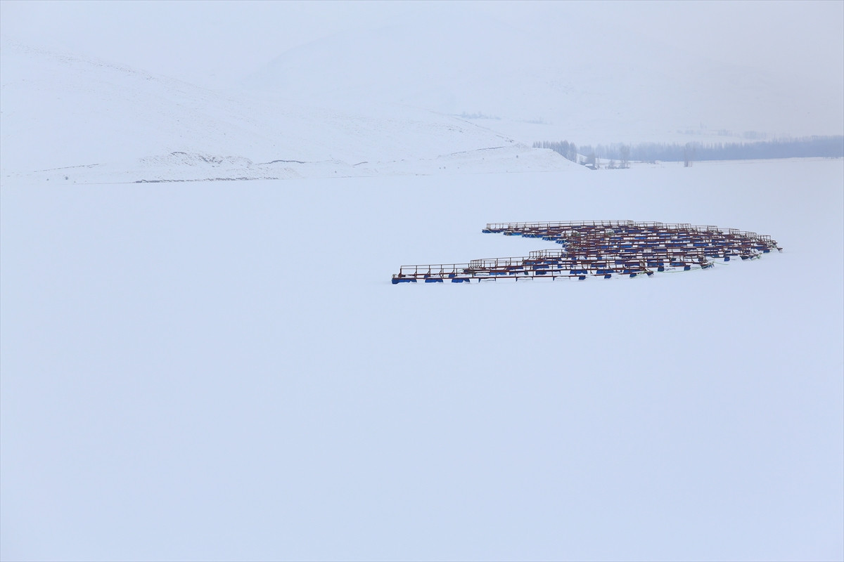 Yaz aylarında yaklaşık 15 bin hektarlık tarım arazisini sulamak için kullanılan, aynı zamanda kafes balıkçılığı da yapılan baraj gölünde, balık kafesleri buz kütlesinin içinde kaldı.