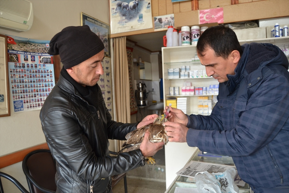 Osman köyünde yaşayan Recep Dündar, yol kenarında baygın halde bulduğu yavru kızıl şahini veteriner hekim Ahmet Küçükbaş'a götürdü.