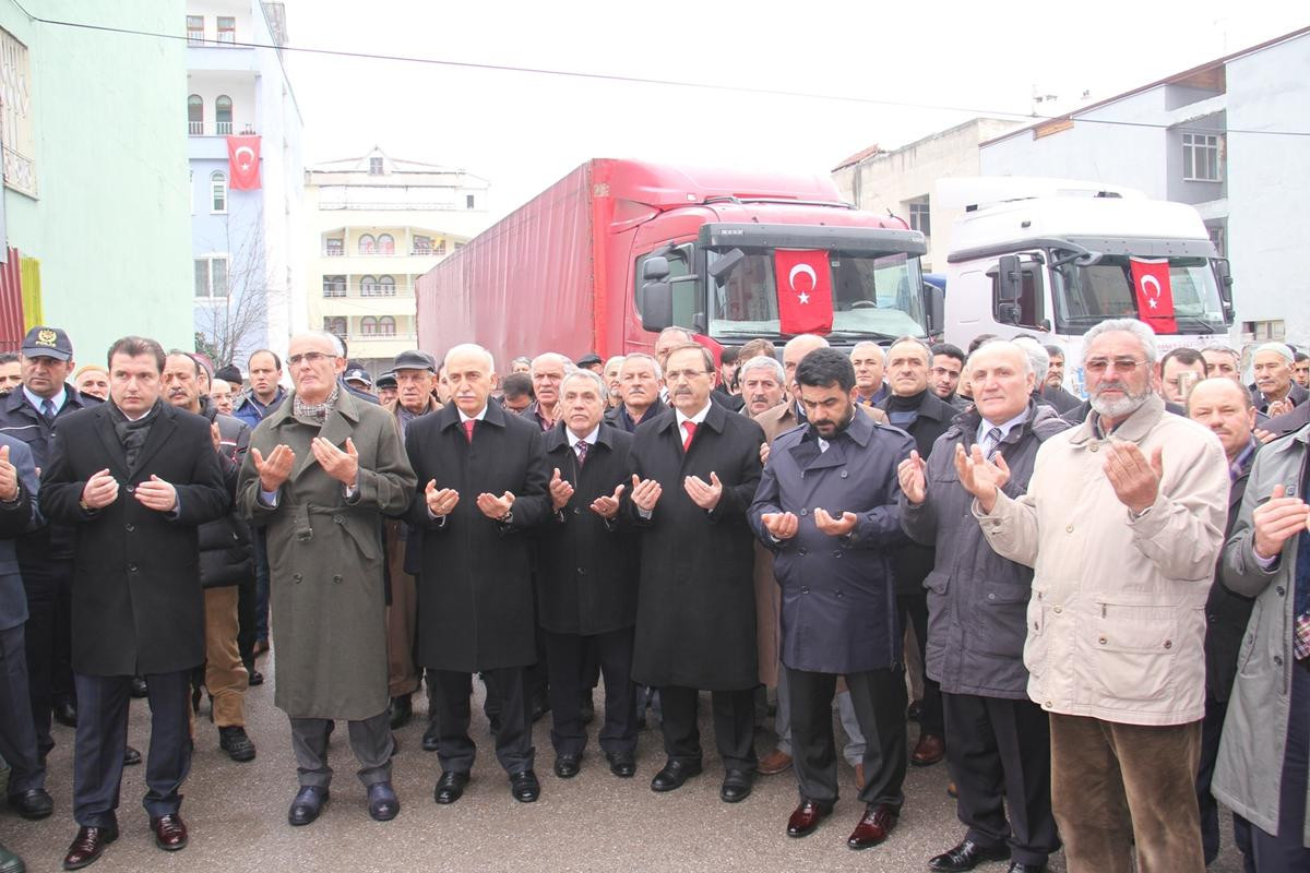 Konuşmaların ardından, Suriye Bayırbucak Türkmenlerine gönderilecek 180 ton kuru gıda maddesinin bulunduğu 6 tır, dualarla uğurlandı.
