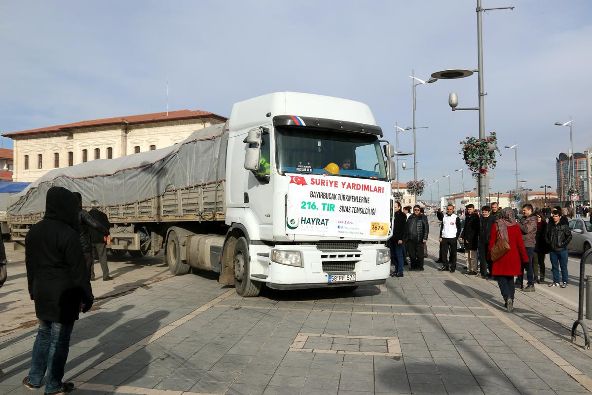 SİVAS (AA) - Hayrat İnsani Yardım Derneği Sivas Şubesince temin edilen 5 tır yardım malzemesi, Bayırbucak Türkmenlerine gönderildi.