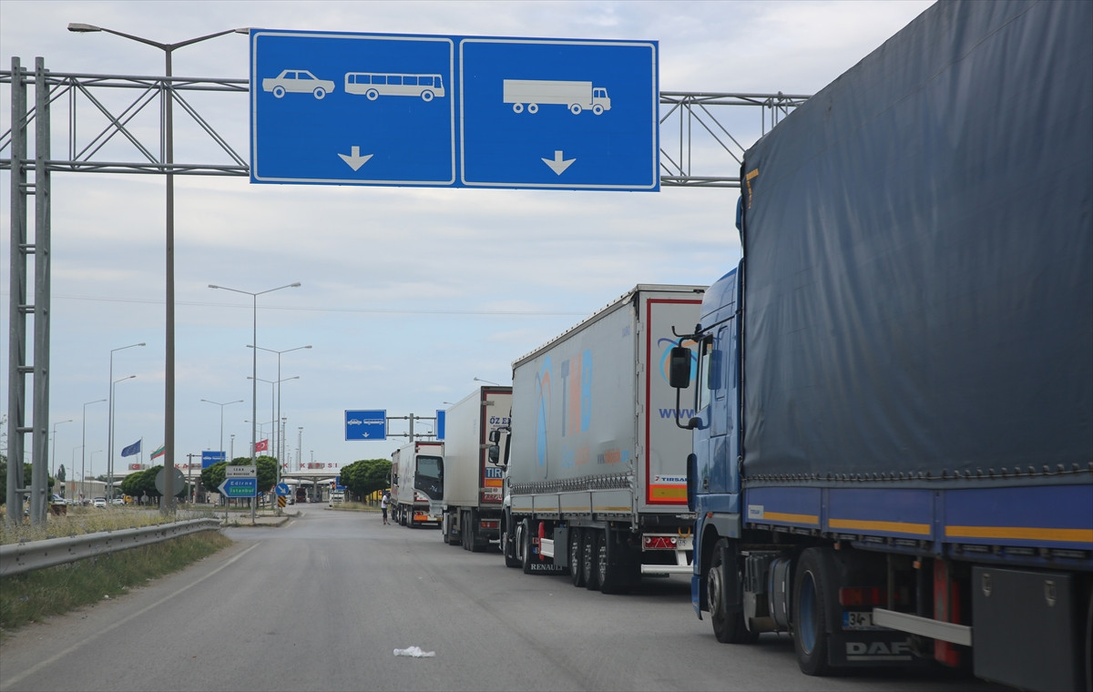EDİRNE (AA) - Bayramın ilk gününde yurt dışına çıkmak için Kapıkule Sınır Kapısı'na gelen tırlar, yaklaşık 10 kilometrelik kuyruk oluşturdu.