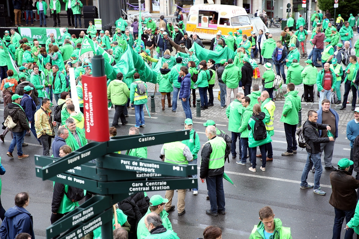 Nord tren istasyonunda toplanan sendika üyeleri, Kraliyet sarayı, parlamento ve Brüksel yerel hükümet binalarının önünden geçerek şehir merkezine vardı. Hükümetin tasarruf önlemlerinin eleştirildiği pankart ve döviz taşıyan göstericiler, sık sık fişek de attı.