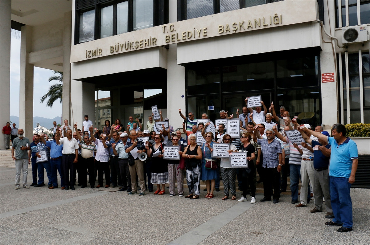 İZMİR (AA) - ESHOT, İZSU ve İzmir Büyükşehir Belediyesi'nden emekli bir grup, ulaşım hizmetlerinden ücretsiz faydalanmalarını sağlayan kartların iptalini protesto etti.