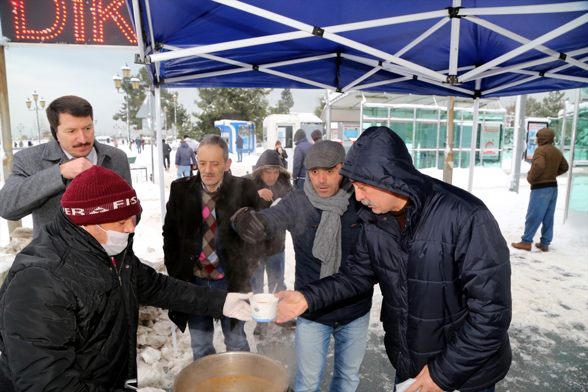 Samsun'da 3 gündür devam eden yoğun kar yağışı nedeniyle tramvay çalışmazken, ulaşımda büyük aksamalar yaşandı. İlkadım Belediyesi, sabah erken saatlerinden itibaren yürüyerek işine gitmek zorunda kalan vatandaşlara, ilçenin 10 farklı yerinde kurduğu çadırlarda çorba ikramında bulundu.
