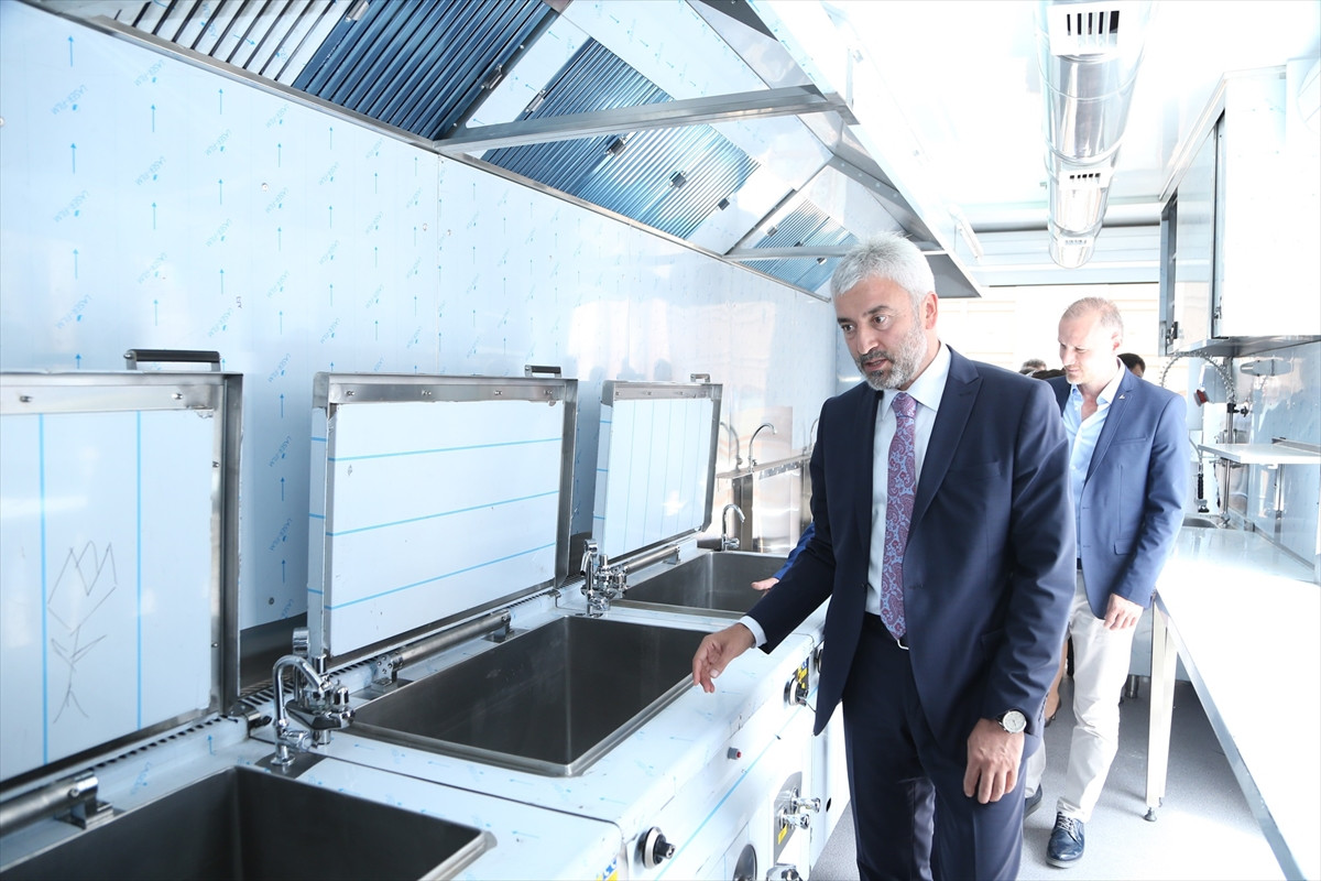 Büyükşehir Belediye Başkanı Enver Yılmaz, 1 milyon lira maliyetli ve içinde 5 bin kişinin günlük ihtiyacını karşılayacak yeme içme sistemi barındıran tam donanımlı mobil tırda incelemede bulundu.
