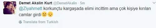 Yaralananlar arasında ünlü şarkıcı Demet Akalın da vardı. Restoranda yemek yiyen Akalın , 'Korkunçtu kargaşada elimi incittim ama çok kişiye kırılan camlar girdi' diye tweet attı.