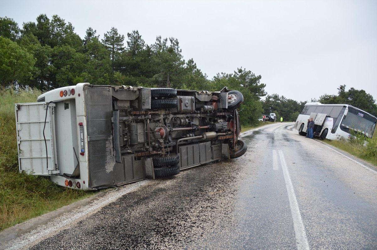 Alınan bilgiye göre, kentte faaliyet gösteren bir çimento fabrikasında çalışan işçileri taşıyan, sürücüsünün kimliği henüz belirlenemeyen 61 VP 586 plakalı servis minibüsü, Bilecik-Yenişehir karayolunun 17. kilometresinde devrildi.