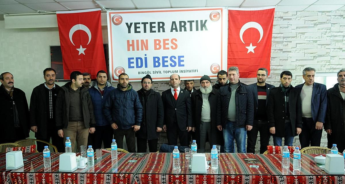 Saray Park'ta bir araya gelen Bingöl Sivil İnisiyatifi Platformu üyeleri, "Yeter Artık-Hin Bes-Edi Bese" sloganıyla basın açıklaması yaparak, bazı ilçelerde hendek kazan, cami ve okul yakan terör örgütü mensuplarının eylemlerine son vermesini istedi.