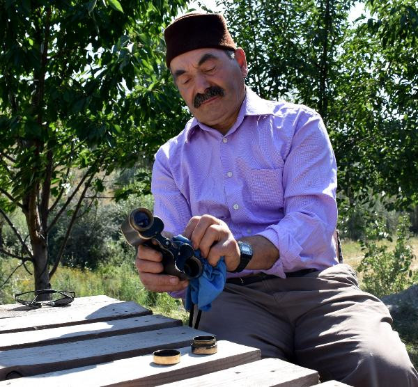 Sivas'ta çiftçi Kazım Ertümen (60) dedesinden kendisine kalan yaklaşık bir asırlık dürbüne gözü gibi bakıyor. Ertümen, yanından hiç ayırmadığı ve ilk günkü gibi çalışan dürbünü ile arazide gezerek etrafı izliyor.