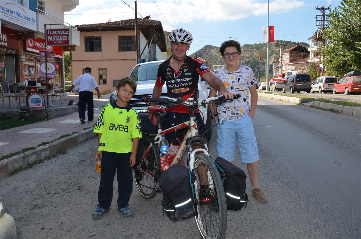 KASTAMONU (AA) - İngiltere'den bisikletle Tayland’ın Bangkok şehrine gitmek için yola çıkan Scott Fairlie, Kastamonu'nun Hanönü ilçesinde mola verdi.