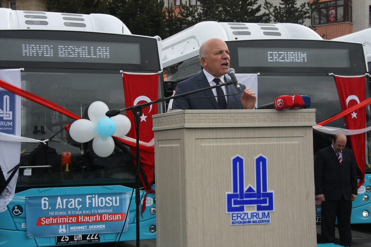 Erzurum Büyükşehir Belediyesinin araç filosuna eklenen 40 belediye otobüsü, 10 itfaiye aracı ve 6 iş makinesinin hizmete alınması dolayısıyla Havuzbaşı Kent Meydanı'nda tören düzenlendi.