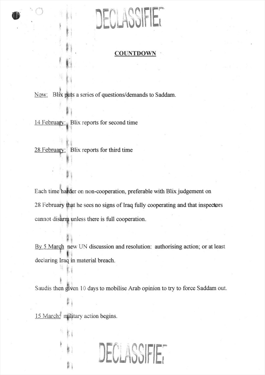 Irak'a müdahaleyi İngiliz parlamentosuna getirmeden çok önce bildiği, hatta planladığı görülen Blair, 30 Ocak 2003'te Bush'a yolladığı özel nota da "Geri sayım" başlığını vermiş.
