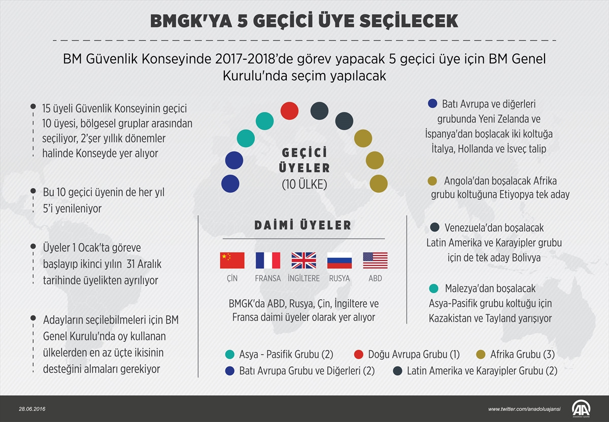 BİRLEŞMİŞ MİLLETLER (AA) - Birleşmiş Milletler Güvenlik Konseyinde 2017-2018 yıllarında görev yapacak 5 geçici üye için BM Genel Kurulu'nda seçim yapılacak.