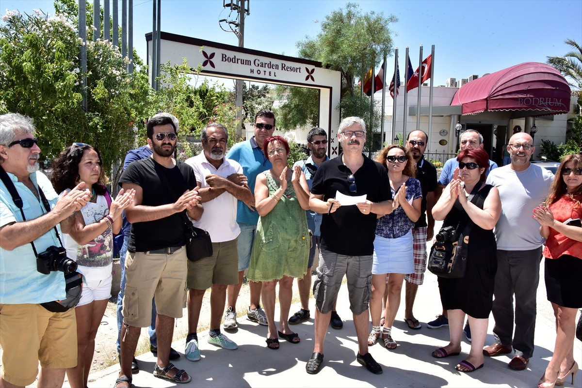 Gümbet Mahallesi'ndeki otelin önünde toplanan Bodrum Basın Platformu üyeleri, otel çalışanlarının fiziksel ve sözlü saldırısına maruz kalan gazeteciye yönelik davranışın affedilemez olduğunu belirterek, baskı ve şiddete karşı tepkisiz kalmayacaklarını bildirdi.