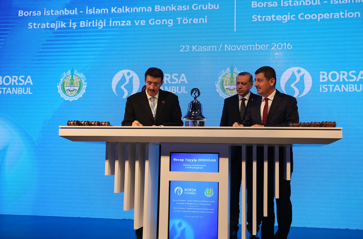 Erdoğan, Borsa İstanbul ile İslam Kalkınma Bankası (İKB) Arasında İmzalanacak Stratejik İş Birliği İçin Mutabakat Zaptı Gong Töreni'nde yaptığı konuşmada, törenin her iki kuruma hayırlı olmasını diledi.